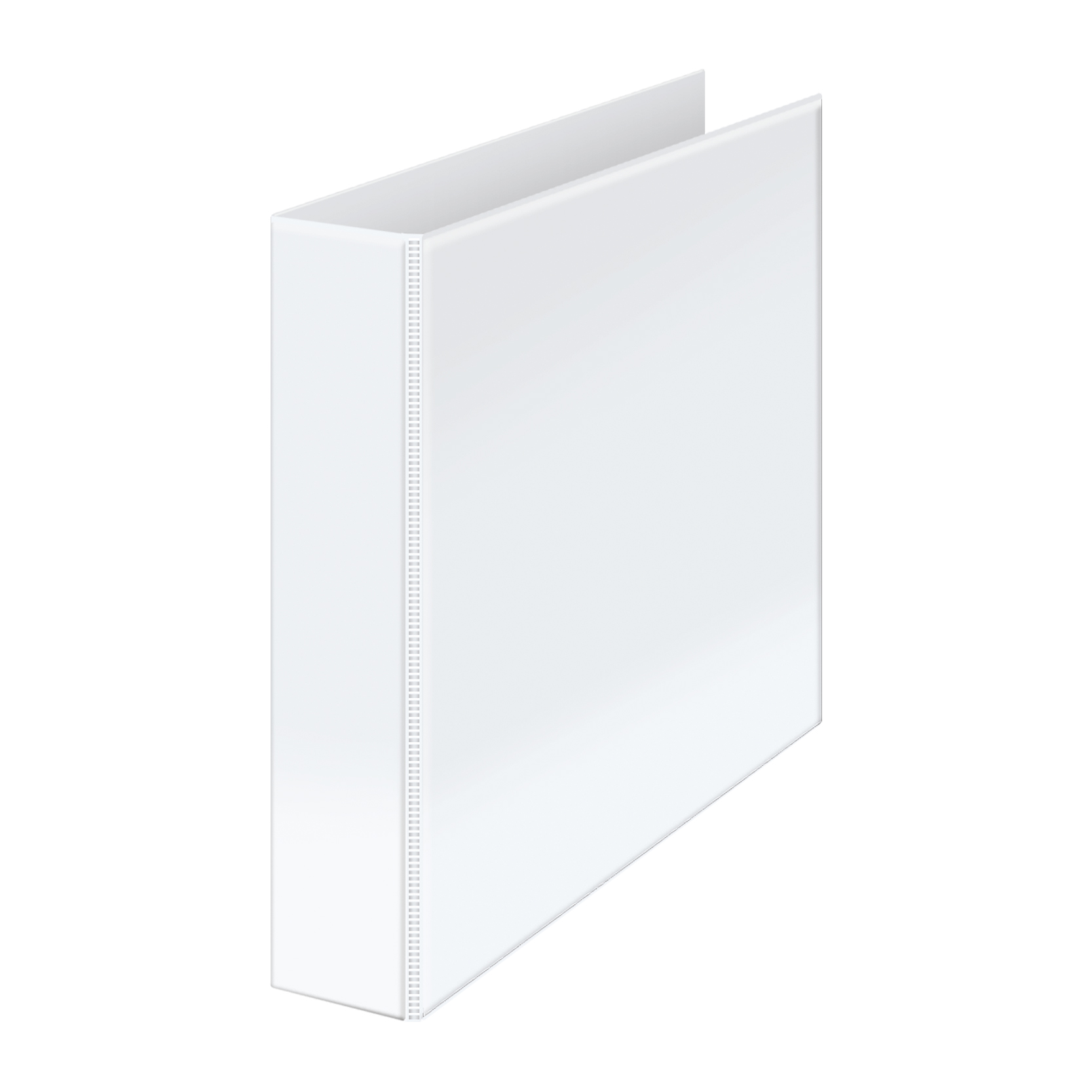 Carpetas en cartón forrado con PVC blanco en tamaño Din A-4. Con bolsa de plástico transparente en el lomo y portada para personalización. Mecanismo de anillas mixtas.