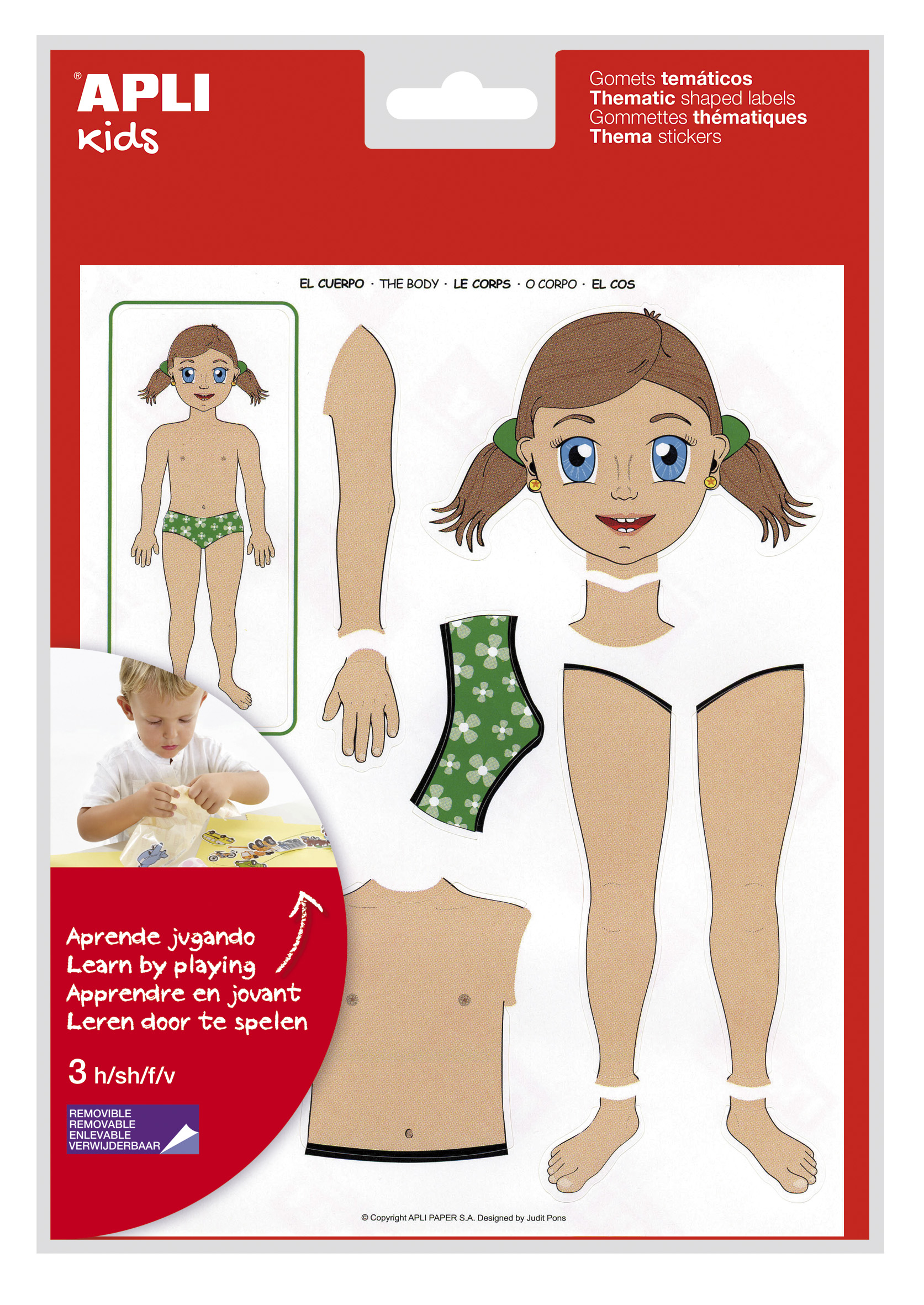 Bolsa de gomets temáticos El Cuerpo: Características: - Cada bolsa contiene 12 hojas, niño y niña, (156 gomets). - Desarrollados con la colaboración de educadores para ayudar a los niños a identificar las diferentes partes del cuerpo colocando las distintas partes en el lugar apropiado. - Actividad que permite a los niños desarrollar sus habilidades motoras. - Gomets de adhesivo removible para que puedan corregir si se equivocan. - Formato ideal para escuelas dado a su gran contenido. Especificaciones: - Gomets APLI cumplen con las más estrictas normas de calidad y seguridad. - Se fabrican conforme a las normas EN-71 y a la cadena de custodia FSC. - Adhesivo base agua. - Libre de disolventes. - Papeles ECF (Elemental Chlorine Free). - Materiales 100% reciclables. ¡Descubre el gran surtido de gomets temáticos que te ofrece APLI!