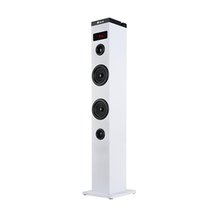 Destaca por su diseño estilizado y elegante, con acabados en tonos blancos y una base para apoyar en el suelo que encaja en cualquier estancia de tu hogar; así como por sus acabados de gran calidad en madera que le permiten alcanzar un sonido nítido y potente. Conecta 2 torres en estéreo gracias al cable de audio, desde la salida de Audio de la torre principal a la entrada de Audio de la torre secundaria. La torre secundaria solo responderá a los controles de la principal.