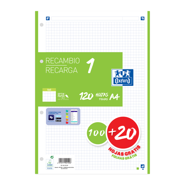El Oxford School A4 Recambio es un cuaderno de tamaño A4 con banda verde, diseñado con cuadrícula de 5x5. Viene en una promoción que incluye 100 hojas más 20 hojas adicionales. Además, cuenta con la tecnología Scribzee para digitalizar y organizar fácilmente tus apuntes.